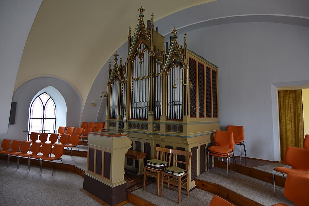 Manual: Bordun 16′, Principal 8′, Salicional 8′, Födött 8′, Csuesfouova 8′, Octava 4′, Dolce 4′, Zergkuert 4′, Quinta II 22/3‘ + 2′, Zimbel II 1 1/3’.
