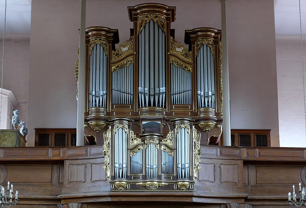 Grand Orgue (C-g3): 56 toetsen Bourdon 16′, Montre 8′, Flûte à Cheminée 8′, Gemshorn 8′, Prestant 4′, Flûte à Cheminée 4′, Nasard 2 2/3′, Doublette 2′, Tierce 1 3/5′, Fourniture 4 rangs, Cymbale 3 rangs, Cromorne 8′.