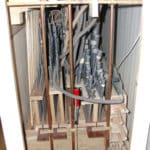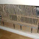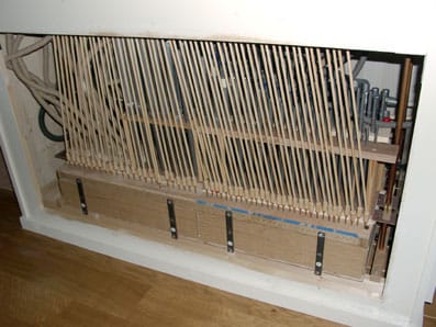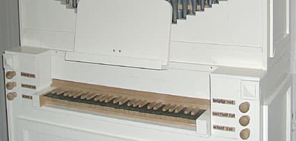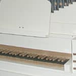 Kast van vuren, inmiddels wit geschilderd. Klavierbeleg ondertoetsen: ebben, boventoetsen: eiken