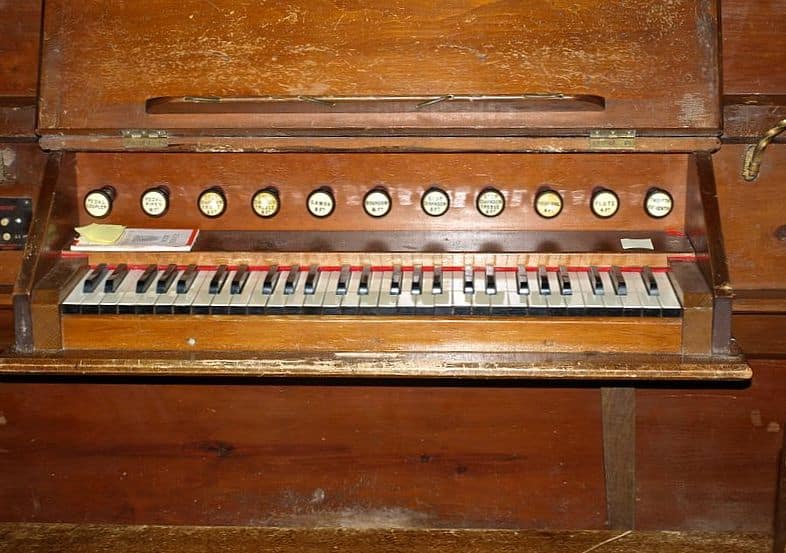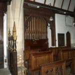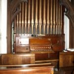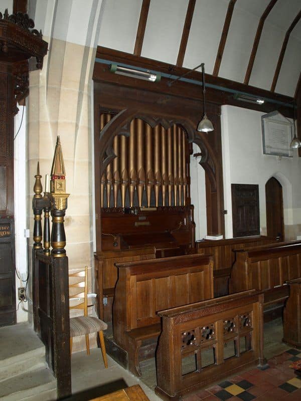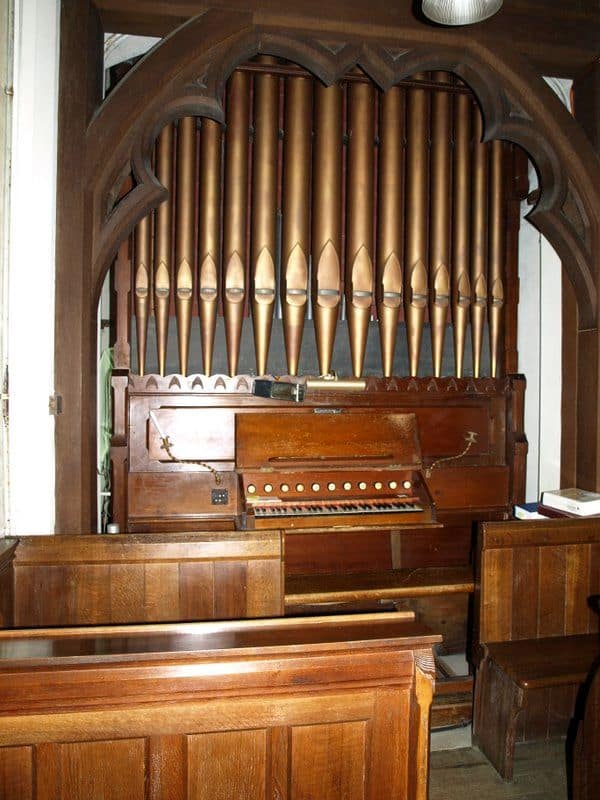 Manual: C – g3 Bourdon 16′, Open Diapason Front 8′ (C-B), Open Diapason Treble 8′ (TC), Stopped Diapason 8′ (C-B), Stopped Diapason Treble 8′ (TC), Gamba 8′, Principal 4′, Flute 4′, Twelfth & Fifteenth 2 2/3’+2”.