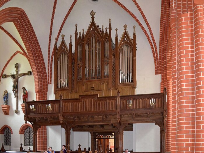 OBERWERK (C – d3) 51 TOETSEN: Quintatön 16′ (from c°) – 2003, Salicional 8′ – 1874/front 2003, Gedackt 8′, Fugara 4′ – 1874, Flöte 4′ – 1822/1874, Flautino 2′ – 1874, Clarinette 8′ – 1874.