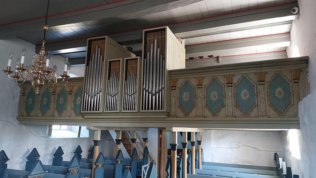 MANUAAL I (C – g3) 56 TOETSEN: Rørfløjte 8′, Principal 4′, Tvaerfløjte 2′ – Bespeelbaar vanaf beide manualen, Quint 1 1/3′ – Bespeelbaar vanaf beide manualen, Sesquialtera II sterk – Bespeelbaar vanaf beide manualen, Mixtur III sterk.