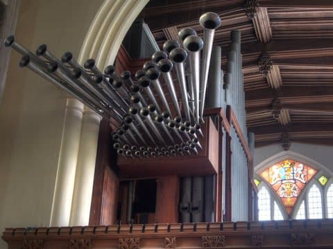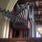 Pedal: Harmonic Bass 32′ – akoestisch, Open Diapason 16′, Open Wood 16′ – digitaal, Violone 16′, Bourdon 16′, Echo Bourdon 16′, Principal 8′, Octave 8′, Bass Flute 8′, Gemshorn 4′, Mixture 4 ranks, Contra Bombarde 32′ – digitaal, Trombone 16′, Bassoon 16′ – digitaal, Trompeta Magna 16′.