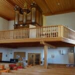 HAUPTWERK (C-f3): 54 TOETSEN Prinzipal 8′, Bourdon 8′, Gambe 8′, Oktave 4′, Rohrflöte 4′, Cornett 4 fach (8′) (c°-f”’), Mixtur 4 fach (2′), Krummhorn 8′.