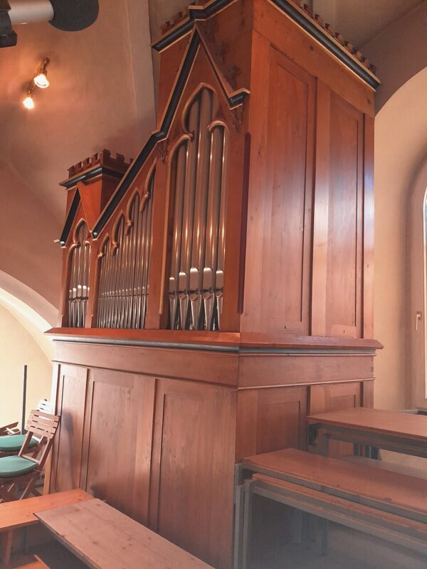 HAUPTWERK (C – g3) 56 TOETSEN: Prinzipal 8′, Hohlflöte 8′, Oktav 4′, Flöte 4′, Quint 2 2/3′, Gemshorn 2′, Mixtur 4 fach (1 1/3′).