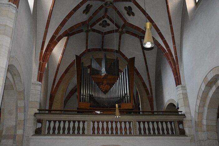 BRUSTWERK: Gedackt 8′, Lieblich Gedackt 4′, Prinzipal 2′, Oktav 1′, Sesquialtera 2 fach (2 2/3′), Zimbel 3 fach (1′), Sordun 16′, Krummhorn 8′, Tremulant.
