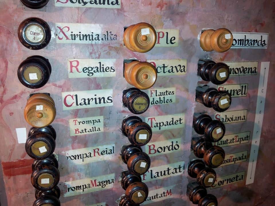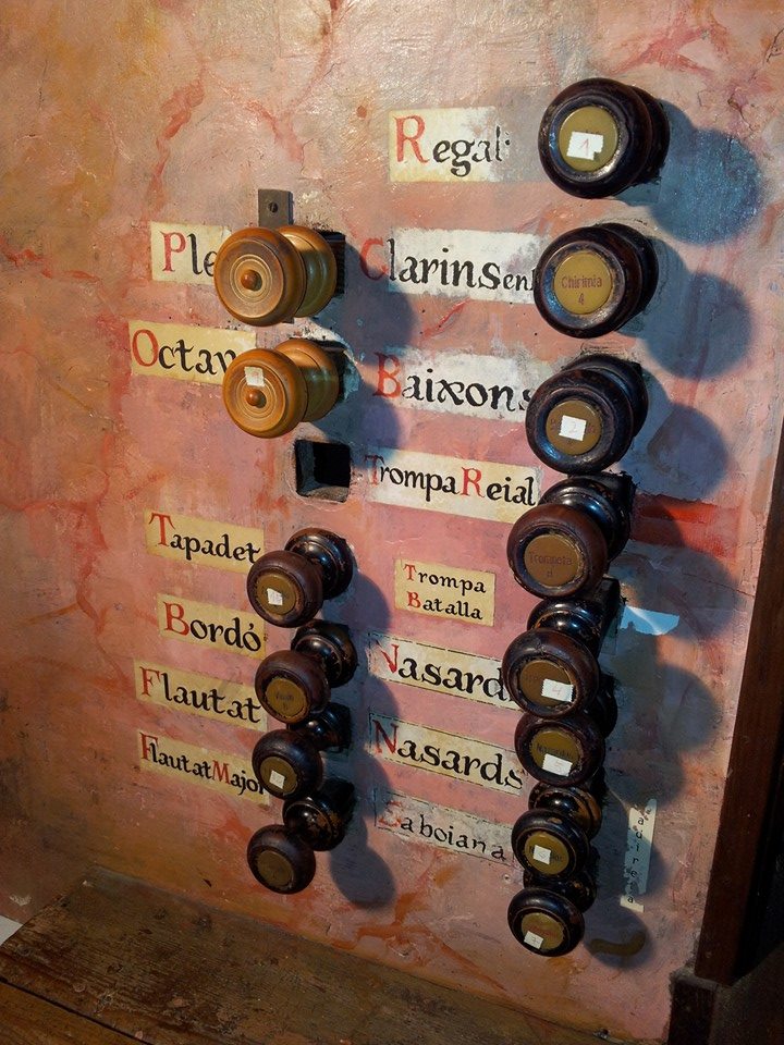 Cadereta Exterior: C – c3 Violón 8′ (B/D), Octava 4′ (B/D), Decinovena 1 1/3′ (2 hilares) (discant), Chiflete 2/3′ (discant), Nazardos 3 hilares (bas), Corneta 3 hilares (discant), Saboyana 8′ (B/D).