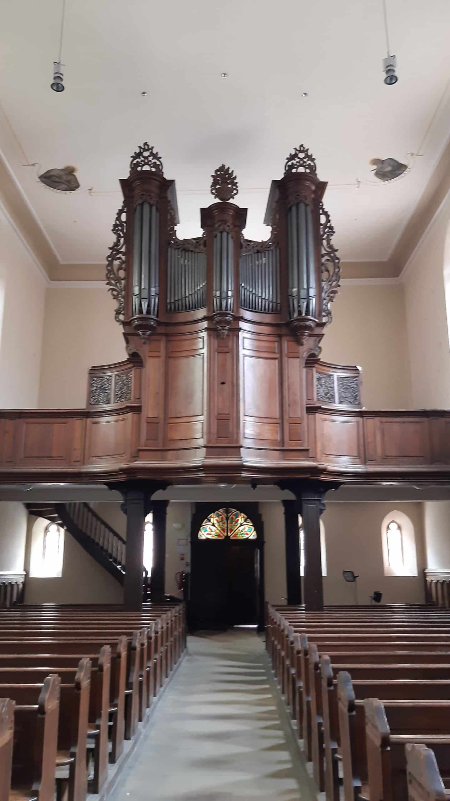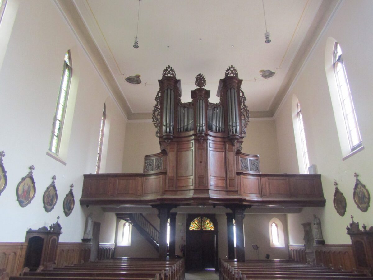 GRAND ORGUE: C – d3 (51 TOETSEN) Montre 8′, Bourdon 8′, Prestant 4′, Flûte 4′, Nasard 2 2/3′, Doublette 2′, Tierce 1 3/5′, Cornet 5 rangs (discant), Fourniture 3 rangs, Cymbale 3 rangs, Trompette 8′ (B/D), Voix Humaine 8′.