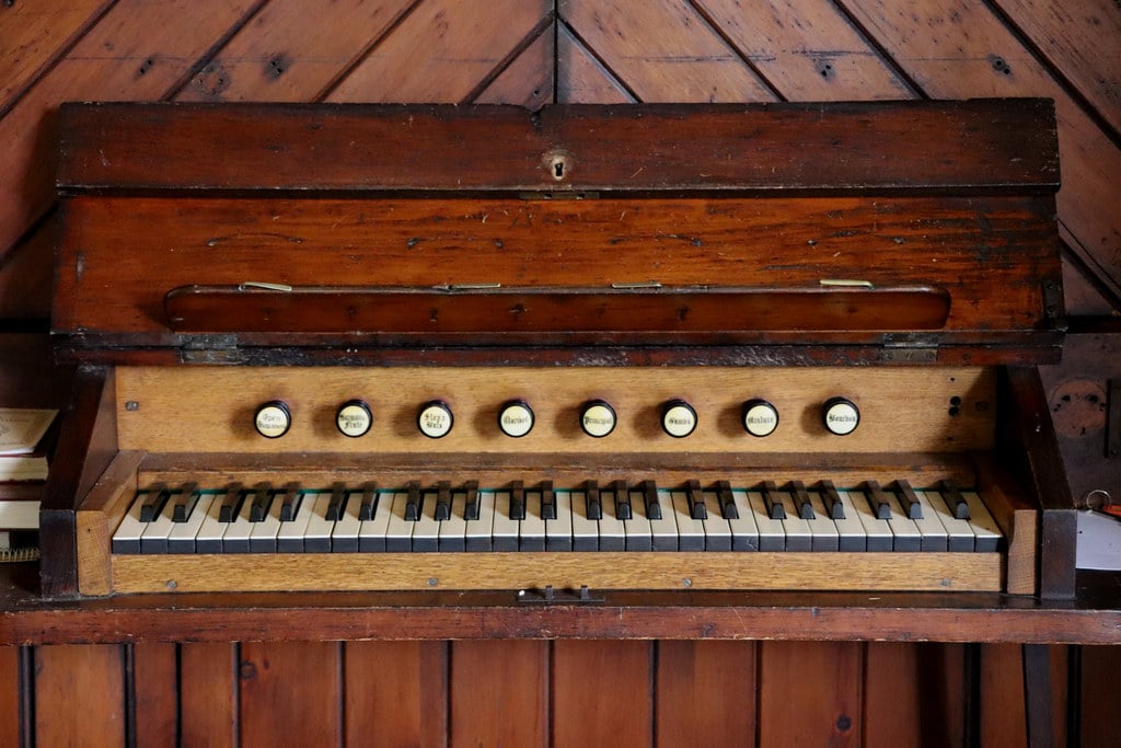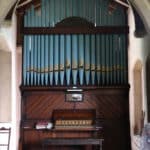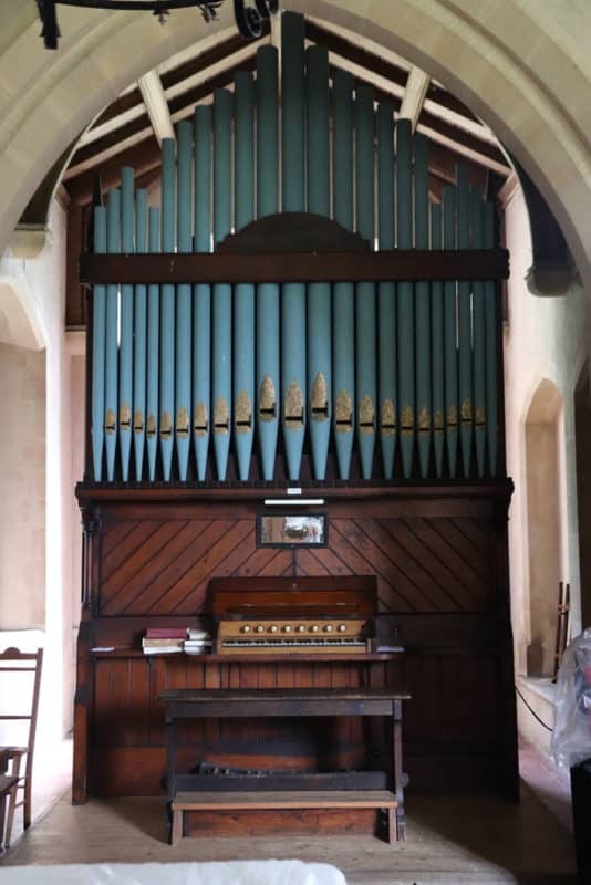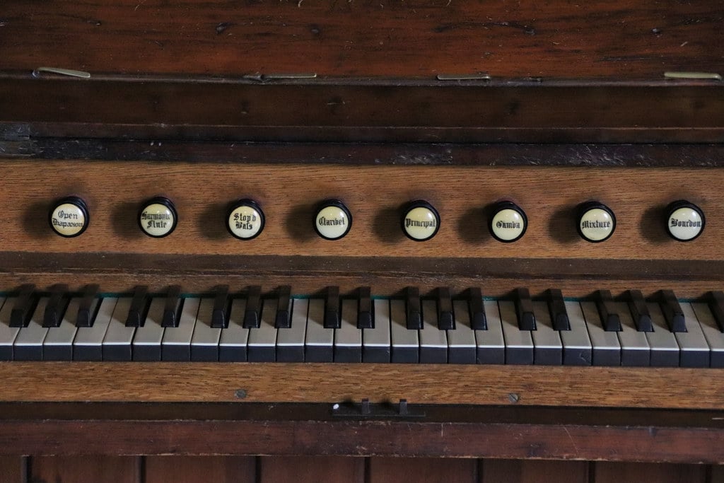 Manual: C – f3 Open Diapason 8′, Gamba 8′ (TC), Claribel 8′ (TC), Stopped Bass 8′ (C-B), Principal 4′, Flute Harmonique 4′, Mixture 2 ranks (12.15).