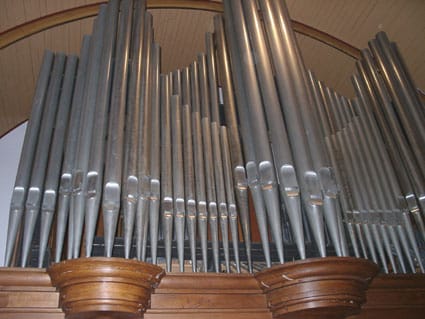 Subbas 16 Gedektbas 16 (tr) Octaafbas 8 Koraalbas 4 Bazuin 16Koppelingen:2 m Manuaal I – Manuaal II, Pedaal – Manuaal I, Pedaal – Manuaal II. |