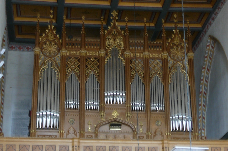 Oberwerk: C-f3 Lieblich Gedackt 16′, Geigenprincipal 8′ – 1847/1929, Salicional 8′, Flaute Traverso 8′, Lieblich Gedackt 8′, Aeoline 8′ – ca. 1910, Oktave 4′, Oktave 2′.