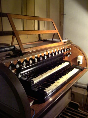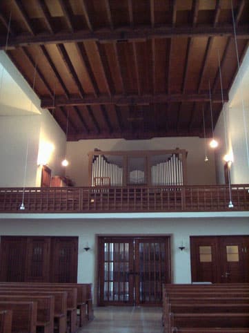 | I. Manual (C-f3, weiß) Bourdon 16 Prinzipal 8 Rohrflöte 8 Viola da Gamba 8 Octave 4 Flauto traverso 4 Octave 2 Terzian 1 3/5– 1 1/3 Scharf 3-4f |