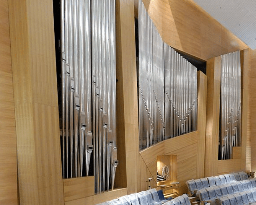 CHORWERK (C – c4) 61 TOETSEN: Lieblich Gedackt 16′, Geigenprincipal 8′, Rohrflöte 8′, Principal 4′, Flöte 4′, Quintflöte 2 2/3′, Flautino 2′, Terzflöte 1 3/5′, Larigot 1 1/3′, Septime 1 1/7′, Sifflöte 1′, None 8/9′, Cornettino 3 fach (2 2/3′), Harmonia Aetheria 6 fach (2 2/3′), Mixtur 5 fach (2′), Guan (Clarinette) 8′, Vox Humana 8′, Tremolo, Tuba 8′, Tuba 4′.
