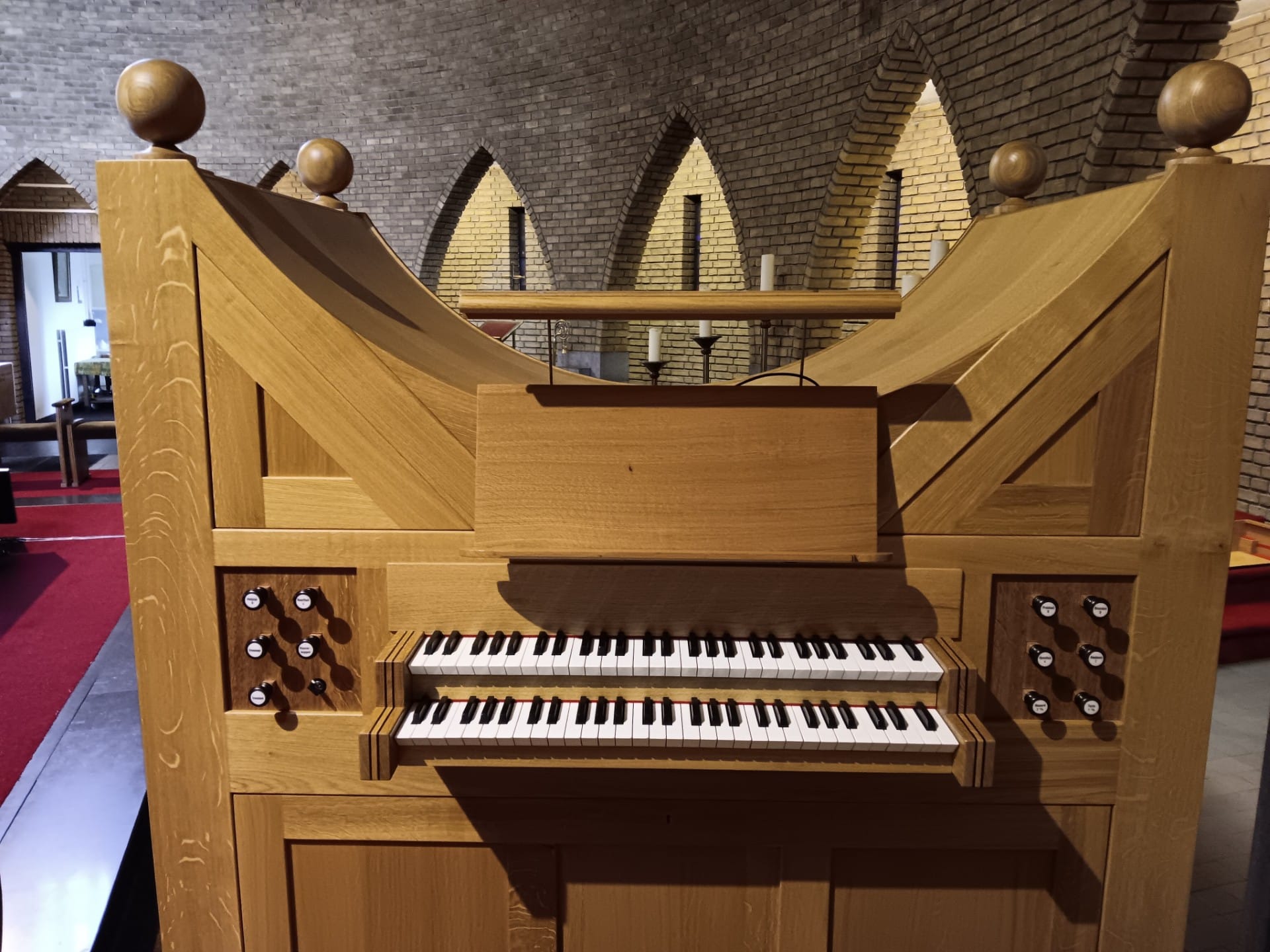 BOVENKLAVIER (C – g3) 56 TOETSEN: Prestant 8′, Bourdon 8′, Openfluit 4′, Nasard 3′, Gemshoorn 2′, Terts 1 3/5′ (D).