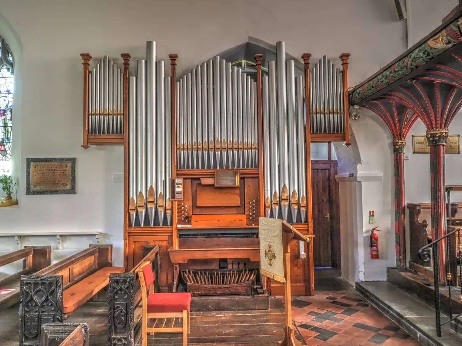 Great: Open Diapason 8′, Dulciana 8′, Clarabella 8′, Stopped Bass 8′, Principal 4′, Flute 4′, Twelfth 2 2/3′, Fifteenth 2′.