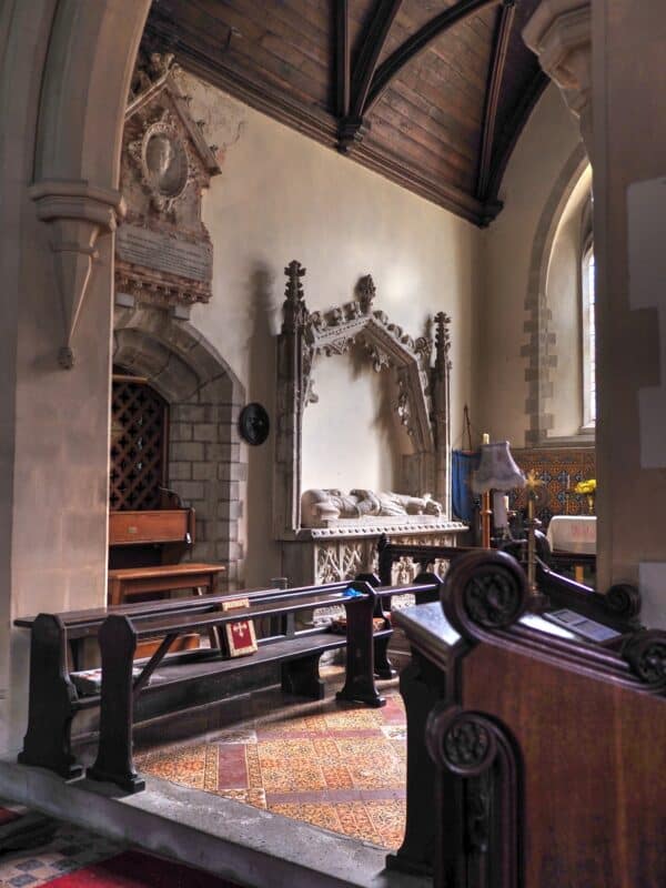 Manual: C – ? Open Diapason 8′, Stopt Diapason Treble 8′, Dulciana 8′, Stopt Diapason Bass 8′, Principal 4′.