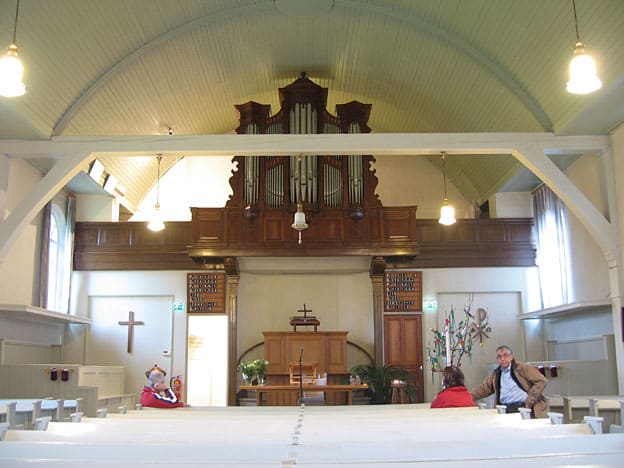 Hoofdwerk (C-f3): 54 toetsen Prestant 8′, Roerfluit 8′, Octaaf 4′, Spitsfluit 4′, Octaaf 2′, Mixtuur IV-V sterk.