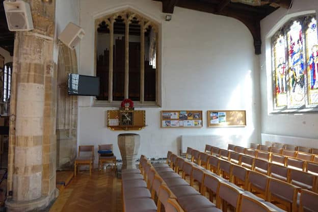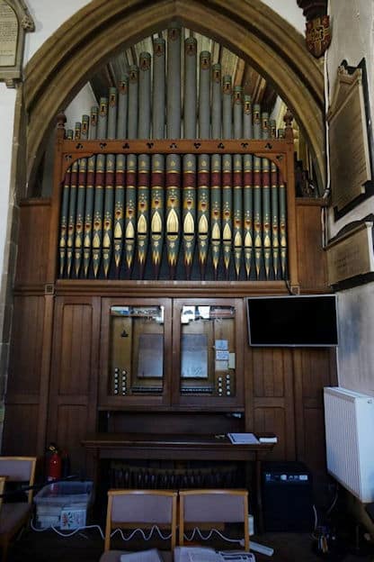 Great: C – g3 (56 toetsen) Open Diapason 8′, Stopped Diapason 8′, Spare (was Mixture III), Spare (was een tongwerk), Principal 4′, Wald Flute 4′ TC (op een Hill rooster), Fifteenth 2′, Clarionet 8′ TC.