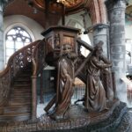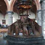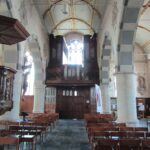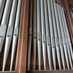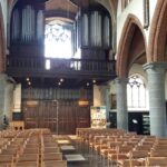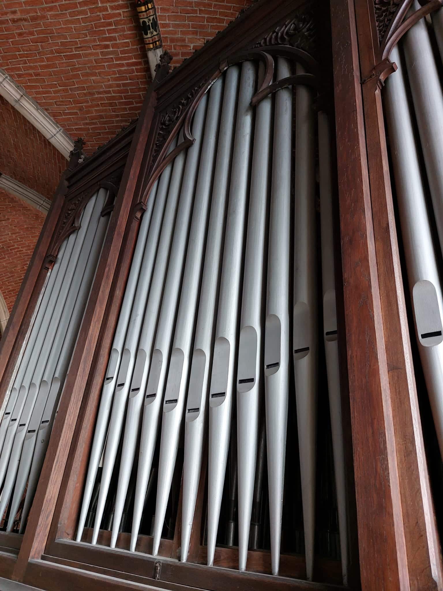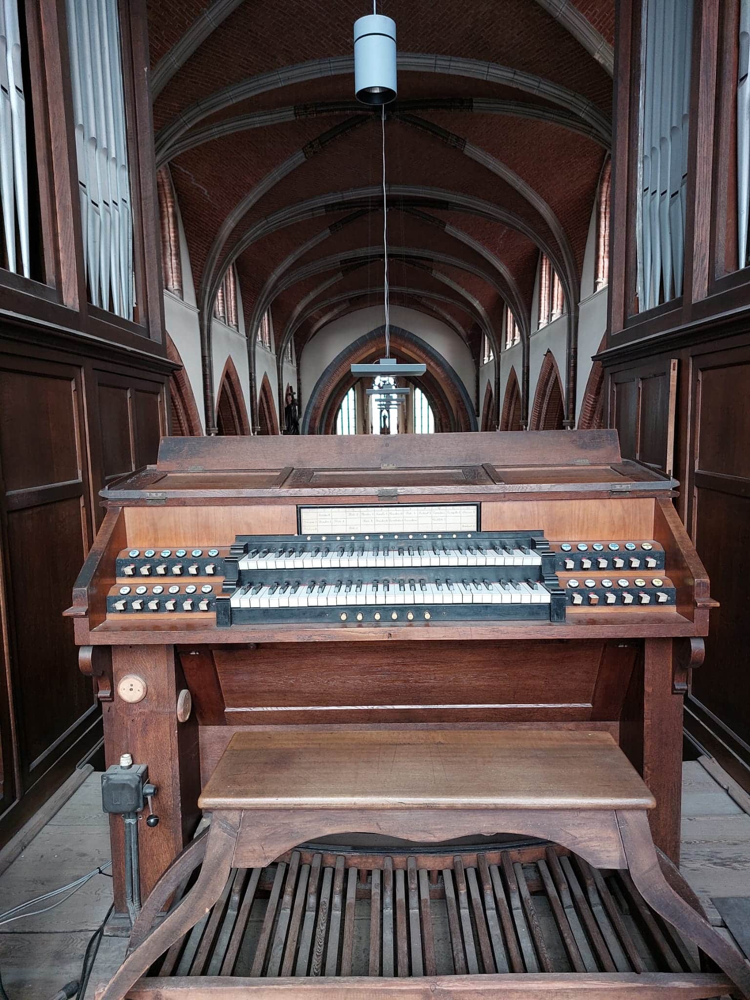 Speeltafel staat tussen de 2 orgelkassen in/ met zicht naar het koor toe.