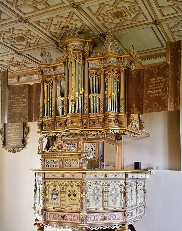 Andreas de Mare bouwde omstreeks 1600 een nieuw mechanisch sleepladen-orgel met orgelluiken voor Kloster Thedinga in Ostfriesland. In 1609 werd het klooster gesloten. De orgelkas werd aangepast en in de Sankt-Georg-Christophorus-Jodokus-Kirche in Stellichte (Niedersachsen) geplaatst. Het pijpwerk kreeg een andere opstelling. In 1910 werd het binnenwerk op de frontpijpen na geheel vernieuwd. Jürgen Ahrend bouwde in 1985 opus 118, een nieuw mechanisch sleepladen-orgel in renaissancestijl met 12 stemmen, 2 manualen en een aangehangen pedaal in de oude kas. De frontpijpen zijn gedecoreerd.