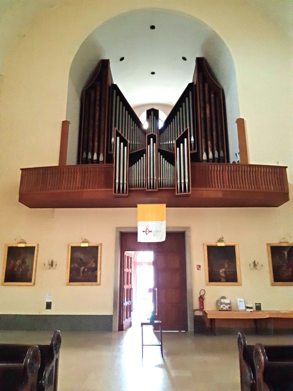 Positif de Dos: C – g3 Montre 8′, Bourdon 8′, Prestant 4′, Flûte à Chéminée 4′, Nazard 2 2/3′, Doublette 2′, Tierce 1 3/5′, Larigot 1 1/3′, Fourniture 4 rangs, Cymbale 3 rangs, Cromorne 8′, Tremblant Doux.