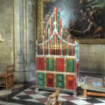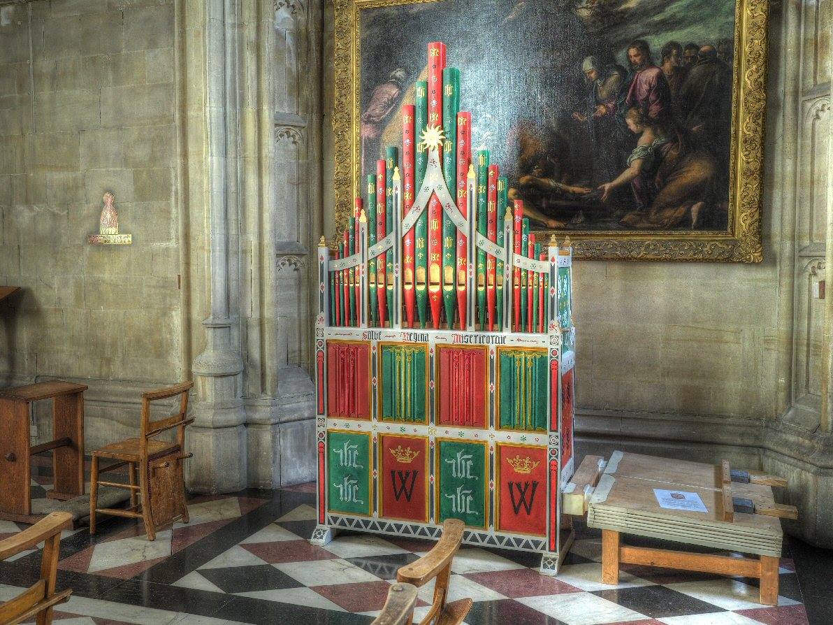 Stoplist: The pipes are all open, and made of oak. The pipes in the front (and the back) are the Principal, a 5ft rank, the inside pipes consist of two Octave ranks and two Fifteenths. The Principal has no slider, but the other four ranks can all be drawn separately. The pitch and scaling of the stops are indicated by the spacing and the toehole sizes on the old soundboard.