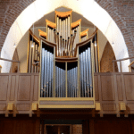 Modern vormgegeven orgelkas in een niet zo hoge kerk, gebouwd op een oksaal in een boog van de kerkruimte.