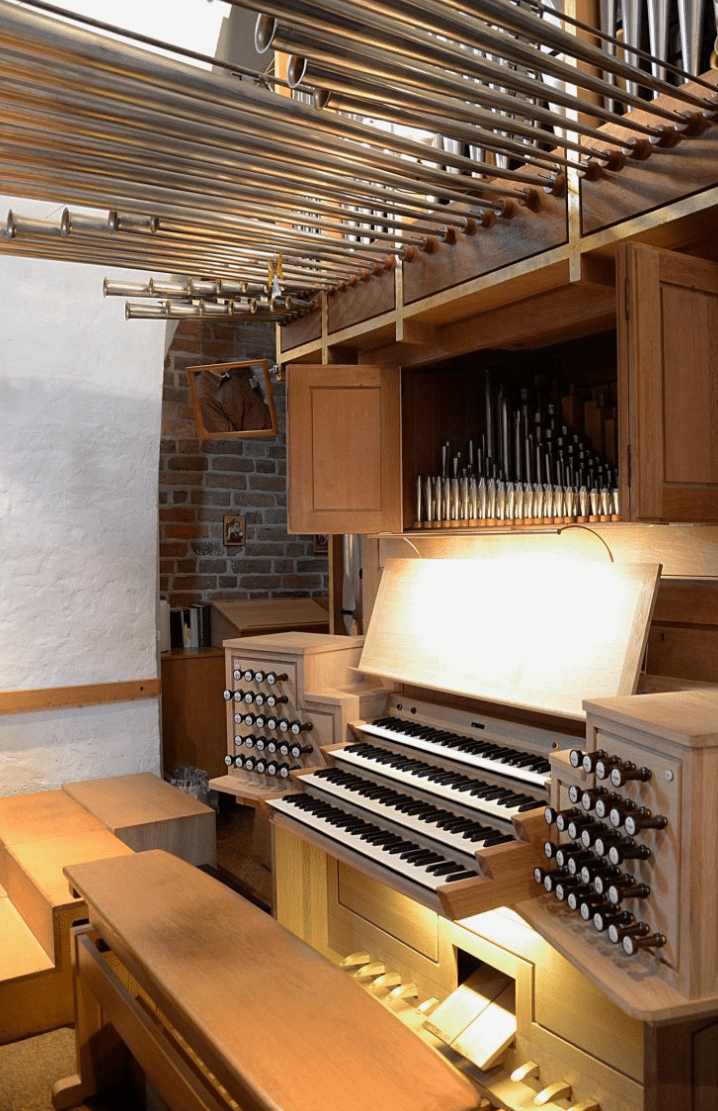 Daardoor zie je, als je de kerk binnenkomt, eerst de mooi afgewerkte achterkant van het orgel.