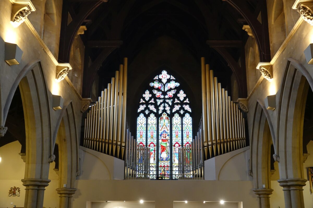 GREAT (C – c4) 61 TOETSEN: Open Diapason 8′, Hohl Flute 8′, Dulciana 8′ TC, Principal 4′, Harmonic Flute 4′, Twelfth 2 2/3′, Fifteenth 2′, Mixture II (19.22), Trumpet 8′.