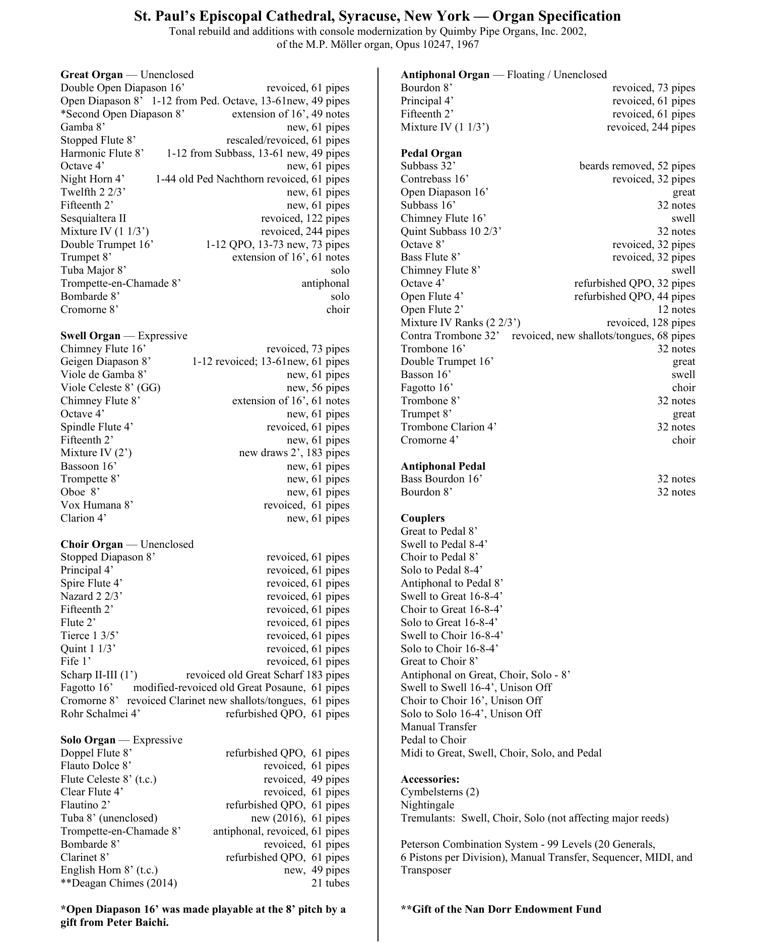 M.P. Möller Company bouwde in 1967 opus 10247. Een nieuw orgel met 4 manualen en een vrij pedaal voor de Saint Paul Episcopal Cathedral in Syracuse (New York) USA. Quimby Pipe Organs bouwde het orgel in 2002 geheel om waarbij de speeltafel werd gemoderniseerd en het instrument werd uitgebreid.