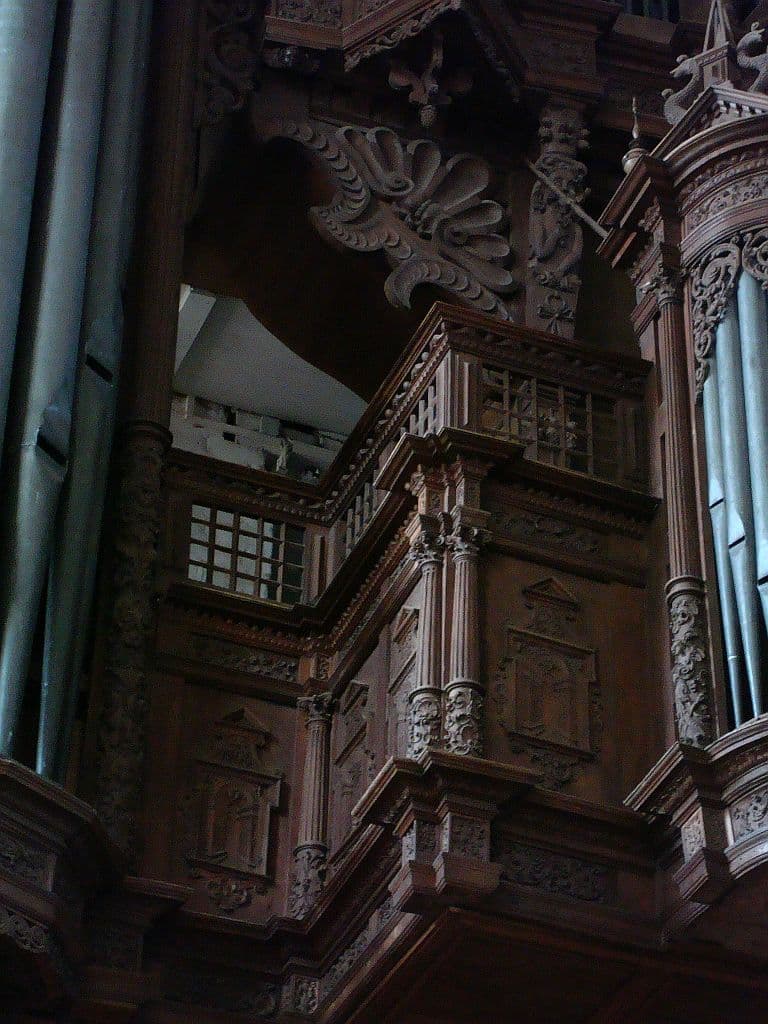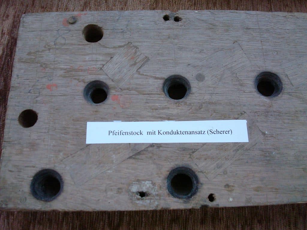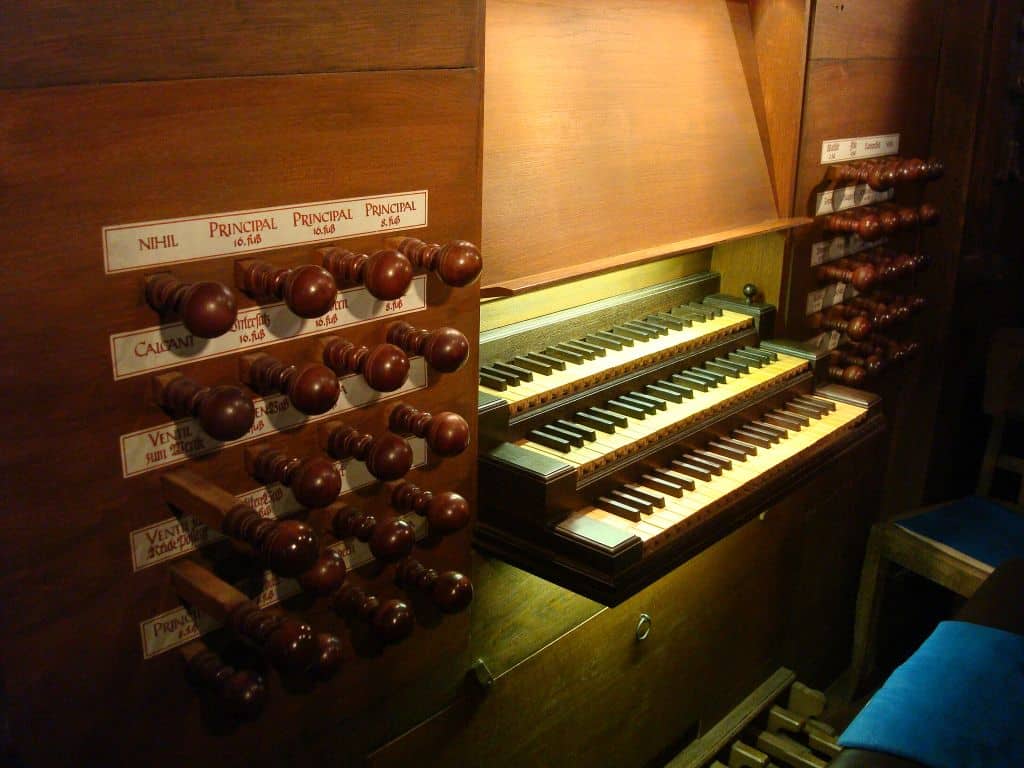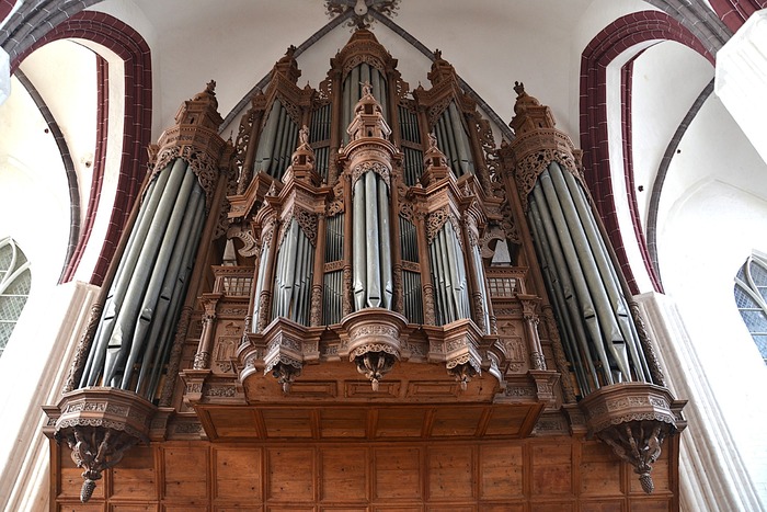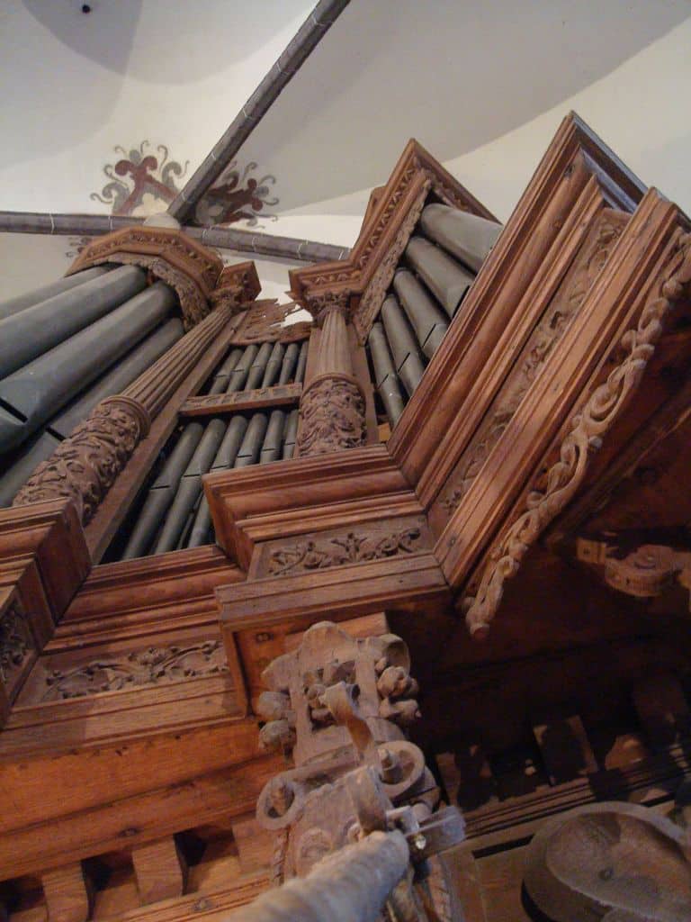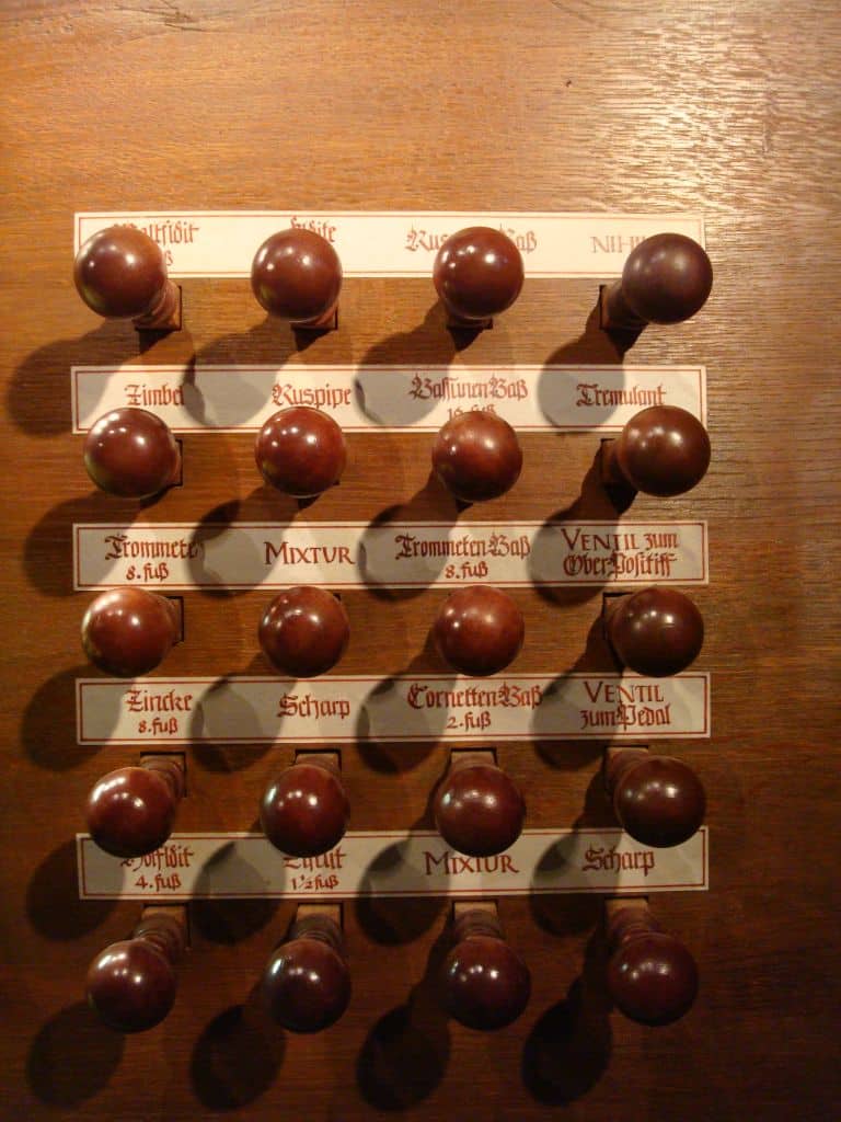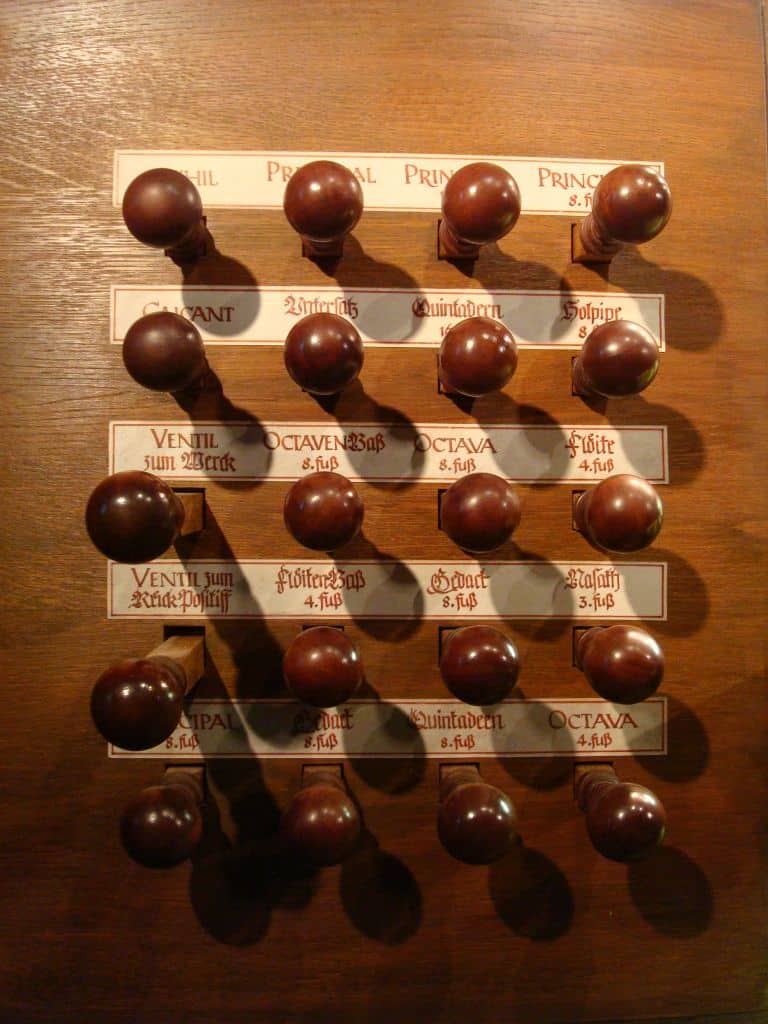 RÜCK POSITIFF (CDEFGA – c3) 45 TOETSEN (KORT OCTAAF): Principal 8′ – discant 2 ranks, Gedact 8′, Quintadeen 8′, Octava 4′, Holflöit 4′, Zifelit 1 1/2′, Mixtur 2-4 fach, Scharp 3-6 fach, Krummhorn 8′ – 2019, Messingregal 8′ – 2019.