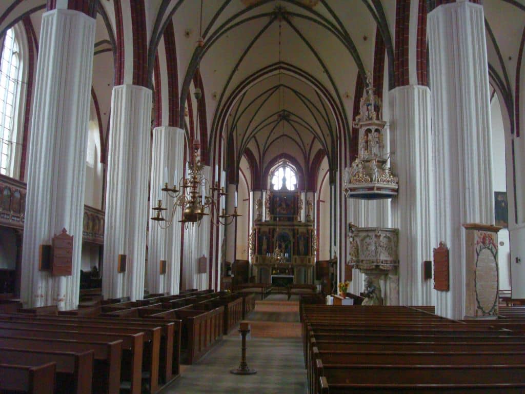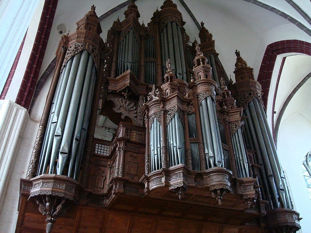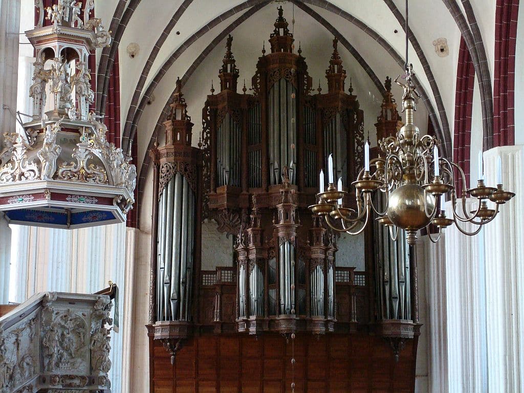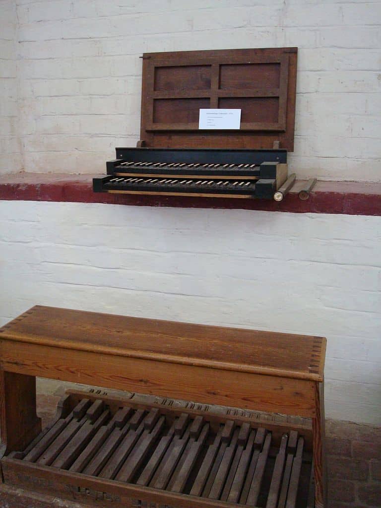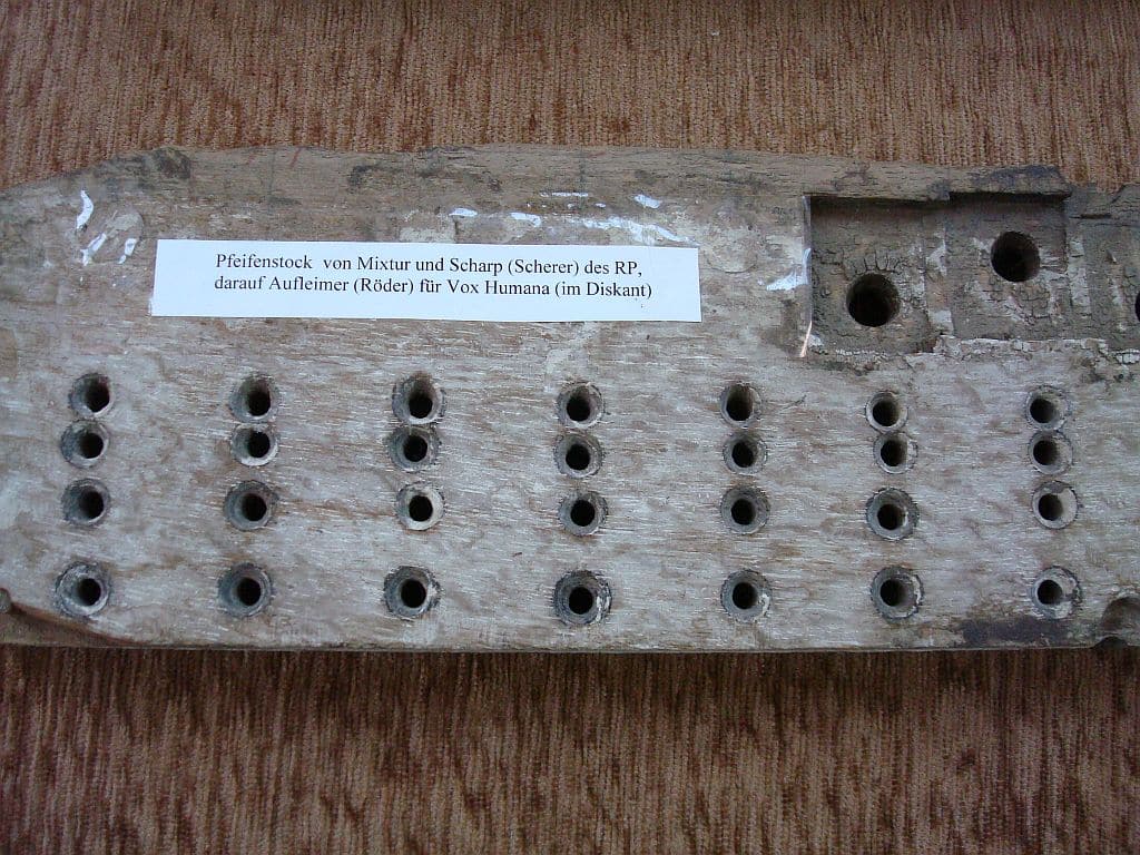 WERCK (CDEFGA – c3) 45 TOETSEN (KORT OCTAAF): Principal 16′, Quintadeen 16′, Octava 8′, Gedact 8′, Flöite 4′, Ruspipe 2 fach, Mixtur 5-8 fach, Scharp 3-5 fach.