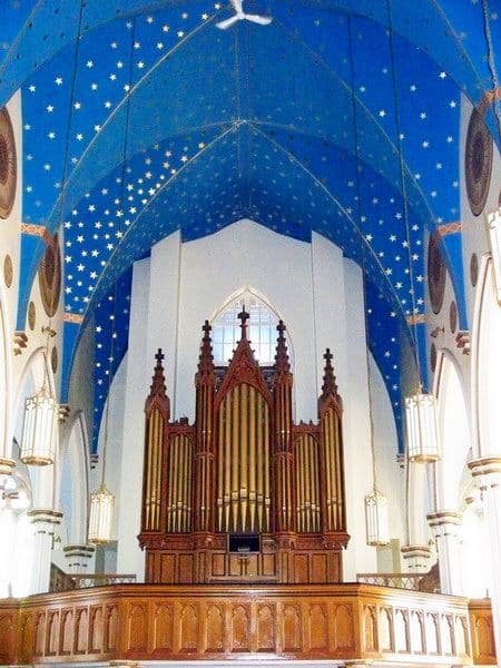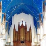 Great Organ: C – g3 Open Diapason 8′, Floete Traverso 8′, Dulciana 8′, Stop’t Diapason 8′, Harmonic Flute 4′, Principal 4′, Fifteenth 2′, Mixtures 2 ranks, Cymbals 3 ranks, Trumpet 8′.