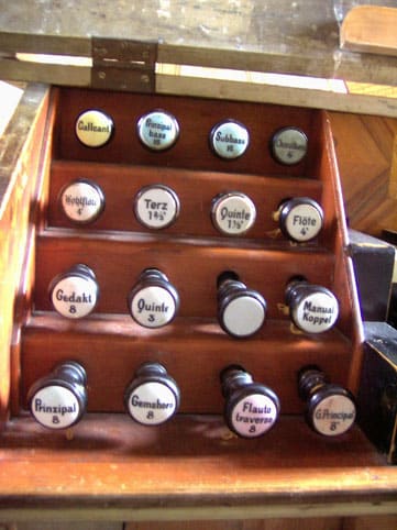 | Hauptwerk: (CD-d3, weiß) Prinzipal 8 Gedakt 8 Hohlflöte 8 Gemshorn 8 Viola di Gamba 8 Octave 4 Hohlflöte 4 Quinte 3 (1952) Octave 2 Terz 1 3/5 (1952) Mixtur 2-4f (2’) Vacat |