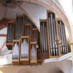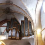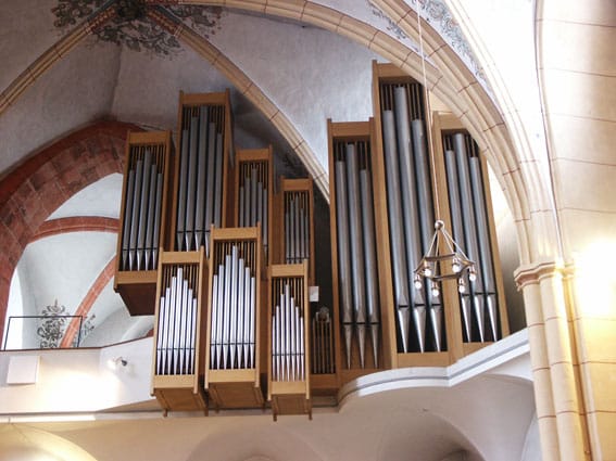 Rückpositiv: Holzgedackt 8 Quintade 8 Principal 4 Spillflöte 4 Flageolett 2 Larigot 1 1/3 Scharff 4f (1′) Rankett 16 Krummhorn 8 Tremulant |
