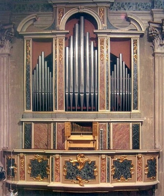 Manuale: C – c3 Principale 8′ (gedeeld), Ottava 4′, Flauto in VIII 4′, Flauto in XII 2 2/3′, Decimaquinta 2′, Decimanona 1 1/3′, Vigesimaseconda 1′, Vigesimasesta 2/3′, Vigesimanona 1/2′, Trigesimaterza 1/3′, Trigesimasesta 1/4′, Cornetta Prima 4’+2 2/3” (discant), Cornetta Seconda 2’+1 3/5” (discant), Fifero 8′ (discant), Tromboncini 8′ (gedeeld) – 2003.