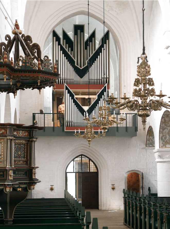 RYGPOSITIV (C – a3) 58 TOETSEN: Principal 8′, Rørfløjte 8′, Oktav 4′, Gedaktfløjte 4′, Nasat 2 2/3′, Spilfløjte 2′, Terts 1 3/5′, Larigot 1 1/3′, Mixtur 4 kor, Chromorne 8′, Regal 8′, Tremulant.