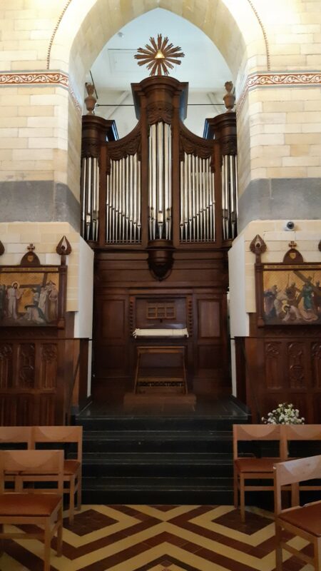 Hoofdmanuaal (C-g3): 56 toetsen Montre 8′, Gambe 8′, Salicional 8′, Bourdon 8′, Prestant 4′, Dolce 4′, Flûte 4′, Doublette 2′, Flageolet 1 1/3′ (discant), Cornet 3 rangs (from cis’), Fourniture 1-3 rangs, Trompette 8′, Clairon 4′ – 2020.