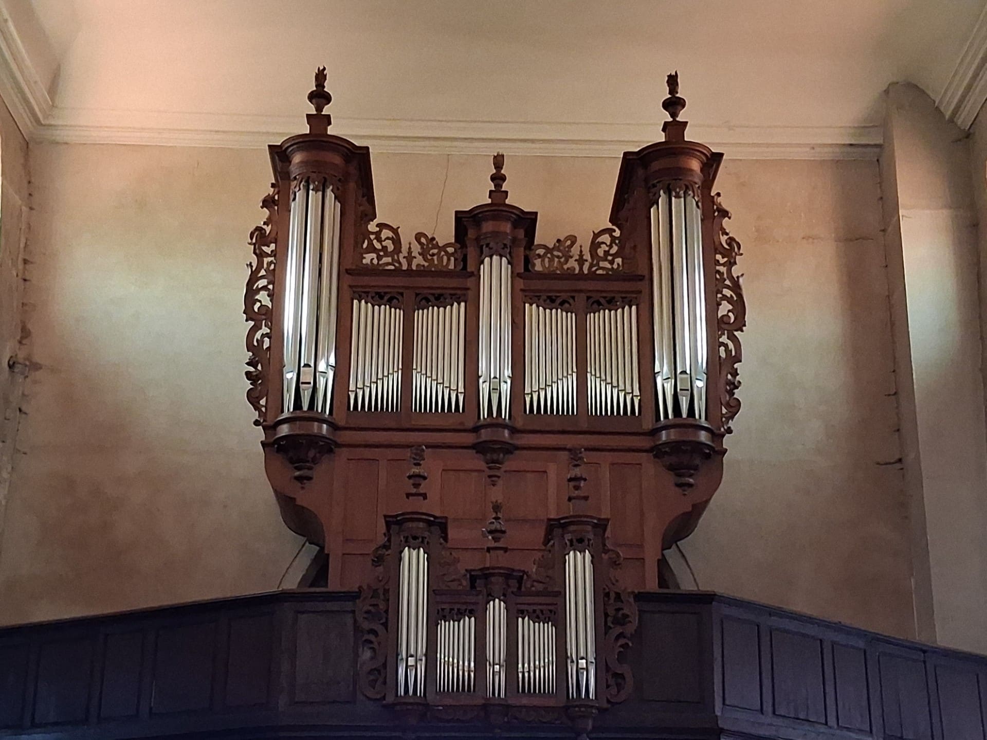 GRAND-ORGUE (CD – d3) 50 TOETSEN: Montre 8′, Bourdon 8′, Prestant 4′, Flûte 4′, Nazard 2 2/3′, Quarte 2′, Doublette 2′, Tierce 1 3/5′, Cornet 5 rangs, Fourniture 4 rangs, Cymbale 3 rangs, Trompette 8′, Voix Humaine 8′, Clairon 4′.