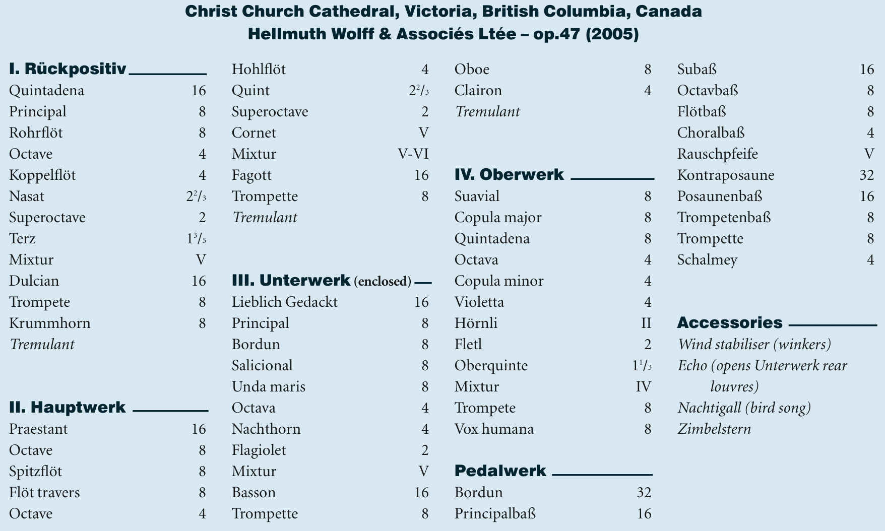 Hellmuth Wolff & Associés Ltée bouwde in het jaar 2005 opus 47. Een nieuw orgel met 4 manualen en een vrij pedaal voor de Christ Church Cathedral in Victoria (British Columbia) Canada. Het pedaalklavier is concaaf.