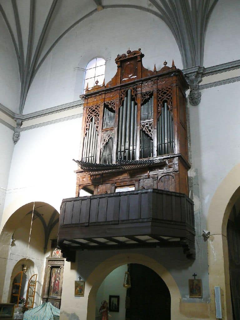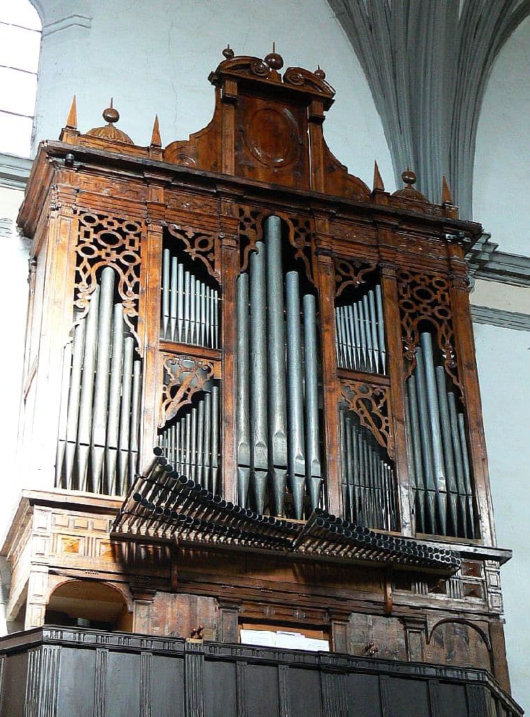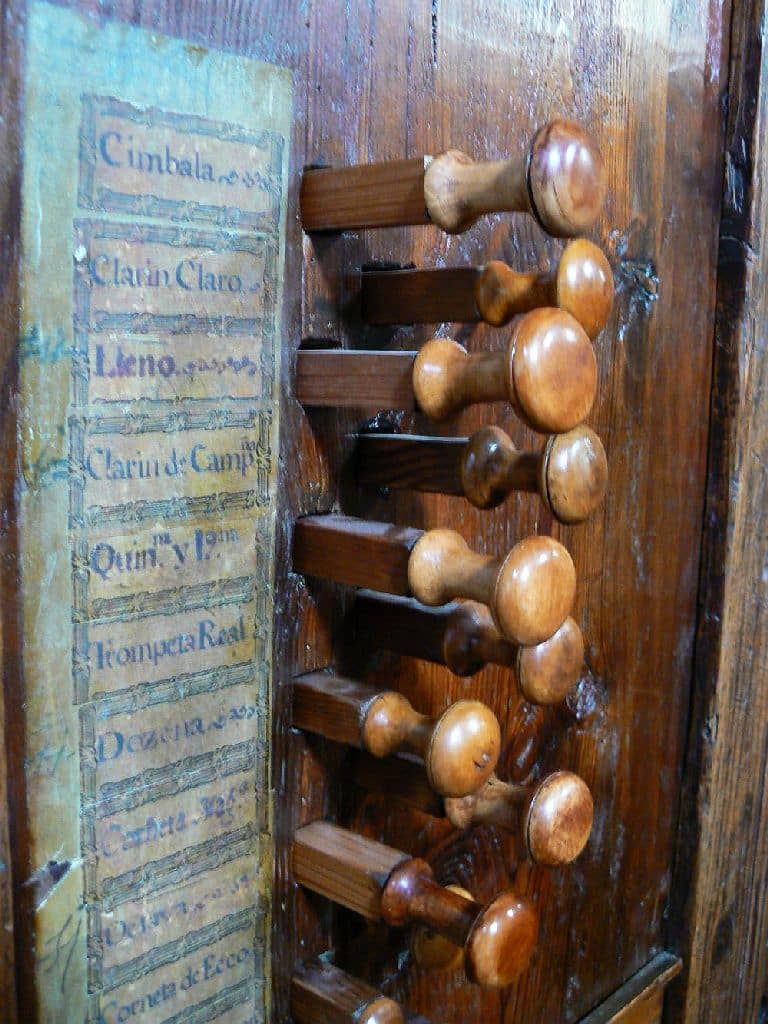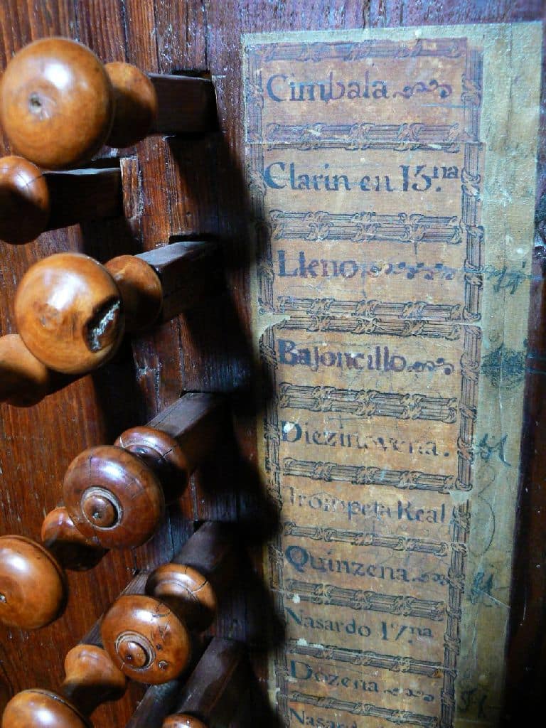 Manual: CDE-c3 Flautado Mayor 8′ (B/D), Violón 8′ (B/D), Octava 4′ (B/D), Docena 2 2/3′ (B/D), Nasardo en 12ª 2 2/3′ (bas), Quincena 2′ (bas), Nasardo en 15ª 2′ (bas), Nasardo en 17ª 1 3/5′ (bas), Nasardo en 15ª y 17ª 2′ + 1 3/5” (discant), Diecinovena 1 1/3′ (bas), Quincena y Diecinovena 2′ + 1 1/3” (discant), Corneta Magna 7 hilares (8′) (discant), Corneta de Eco 5 hilares (8′) (discant), Lleno 4 hilares (B/D), Cimbala 3 hilares (B/D), Trompeta Real 8′ (B/D), Clarín Claro 8′ (discant), Clarín de Campaña 8′ (discant), Bajoncillo 4′ (bas), Clarín 2′ (bas).