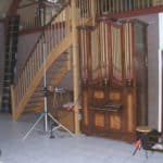 De grote pijp is van de toets CG, en is van de quintadeen 8. Links naast de toets C-groot is nog een toets, en die bedient de ventielen van de Contra-G tonen. Het ziet er nu nog ruim uit in de orgelkas, maar dat zal veranderen zodra het zwelwerk erin geplaatst wordt. En dan zal ook de bovenkant van het orgel dicht zijn.