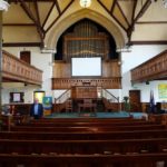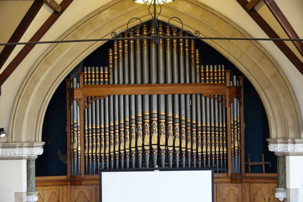 Great: C – c4 Open Diapason 8′ (Bevington), Clarabella 8′ (Bevington), Salicional 8′ (Bevington), Principal 4′ (Bevington), Harmonic Flute 4′ (Bevington), Fifteenth 2′ (Blackett & Howden), Mixture II (19.22 – Blackett & Howden – transposed), Clarinet 8′ TC (Blackett & Howden), Spare knob, Spare knob, Spare knob.