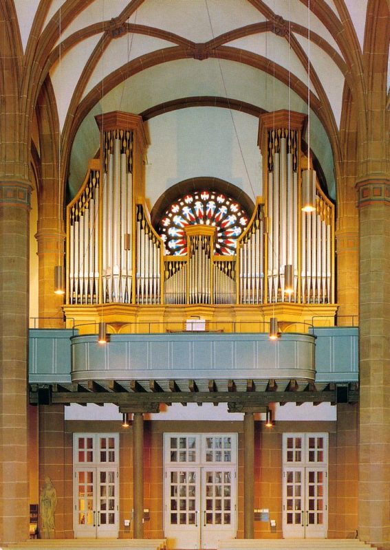 Hauptwerk: C – g3 Gedacktpommer 16′, Principal 8′, Gemshorn 8′, Octave 4′, Rohrflöte 4′, Quinte 2 2/3′ – 1954/1985, Schwiegel 2′, Terz 1 3/5′ – 1985, Mixtur 5 fach (1 1/3′), Trompete 16′, Trompete 8′, Trompete 4′.