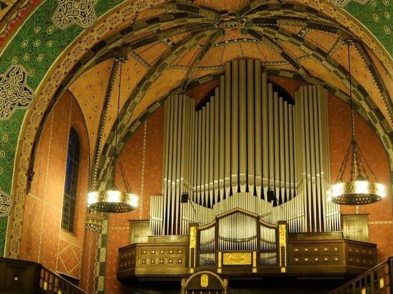 Schwellwerk: C – a3 Quintatön 16′, Principal 8′, Echo Gamba 8′, Lieblich Gedackt 8′, Flauto Dolce 8′, Spitzflöte 8′, Quintatön 8′, Aeoline 8′, Voix Celeste 8′, Viola 4′, Traversflöte 4′, Flautino 2′, Mixtur 3-4 fach (2′), Basson 16′, Oboe 8′, Trompette Harmonique 8′, Clairon 4′, Tremolo.