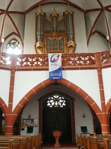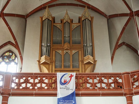 | Hauptwerk: Principal 8 Rohrflöte 8 Viola di Gamba 8 Octave 4 Gedecktflöte 4 Quinte 2 2/3 Octave 2 Mixtur 4 fach (1′) Trompete 8Brustwerk: Holzgedackt 8 Blockflöte 4 Nasard 2 2/3 Schwiegel 2 Terz 1 3/5 Quinte 1 1/3 Vox Humana 8 Tremulant Pedal: |
