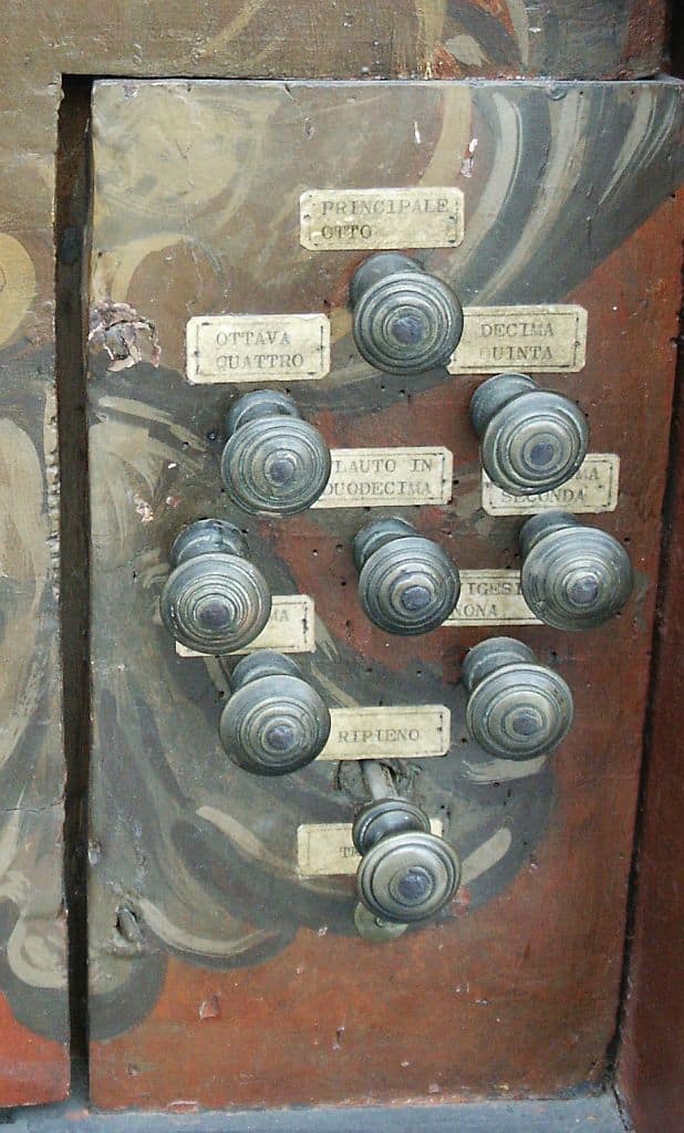 | Manual: (CDEFGA-c3) Principale Otto Ottava Quattro Decima Quinta Flauto in Duodecima Vigesima Secunda Vigesima Nona Vigesima Ripieno Tremolo |