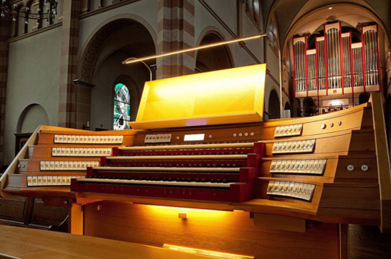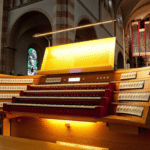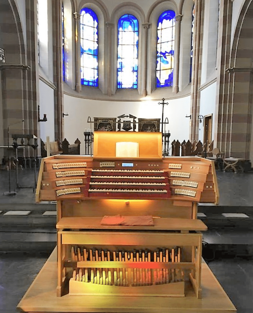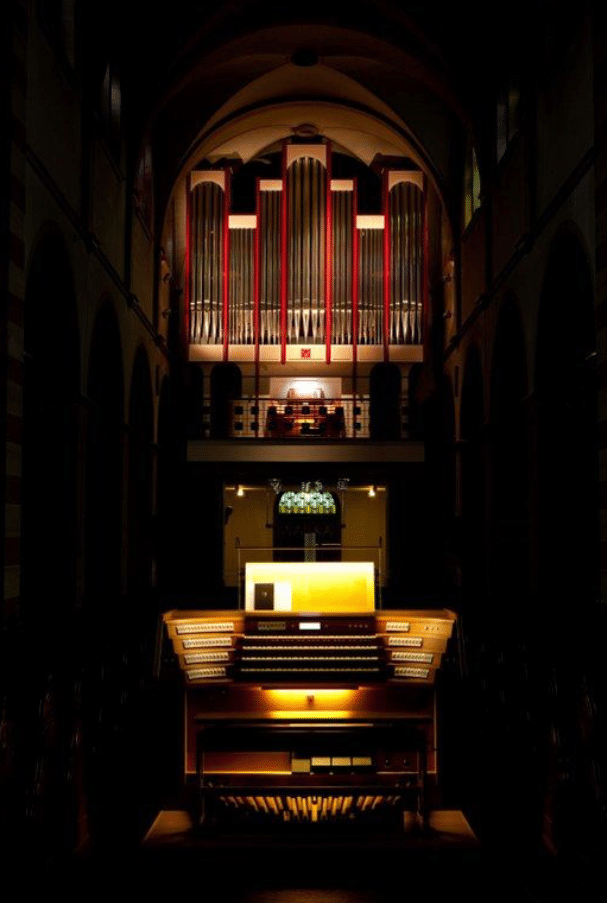 SCHWELLWERK (C – c4) 61 TOETSEN: Violoncello 16′, Geigenprincipal 8′, Nachthorn 8′, Lieblich Gedackt 8′, Viola 8′, Aeoline 8′, Vox Coelestis 8′, Fugara 4′, Concertflöte 4′, Violine 4′, Piccolo 2′, Harmonia Aetherea 2 2/3′, Bombarde 16′, Trompette Harmonique 8′, Oboe 8′, Clairon Harmonique 4′, Tremulant.