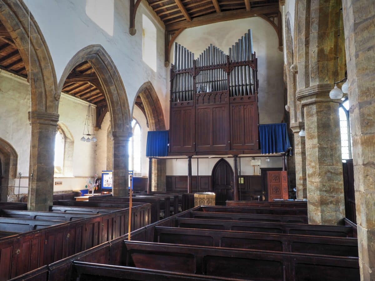 Joseph Halmshaw & Sons bouwde in 1879 een nieuw mechanisch sleepladen-orgel met pneumatische toetstractuur voor het pedaal, 14 stemmen, 2 manualen en een vrij pedaal voor de All Saint’s Church in Wroxton (Oxfordshire) UK. Het pedaalklavier is radiaal concaaf.