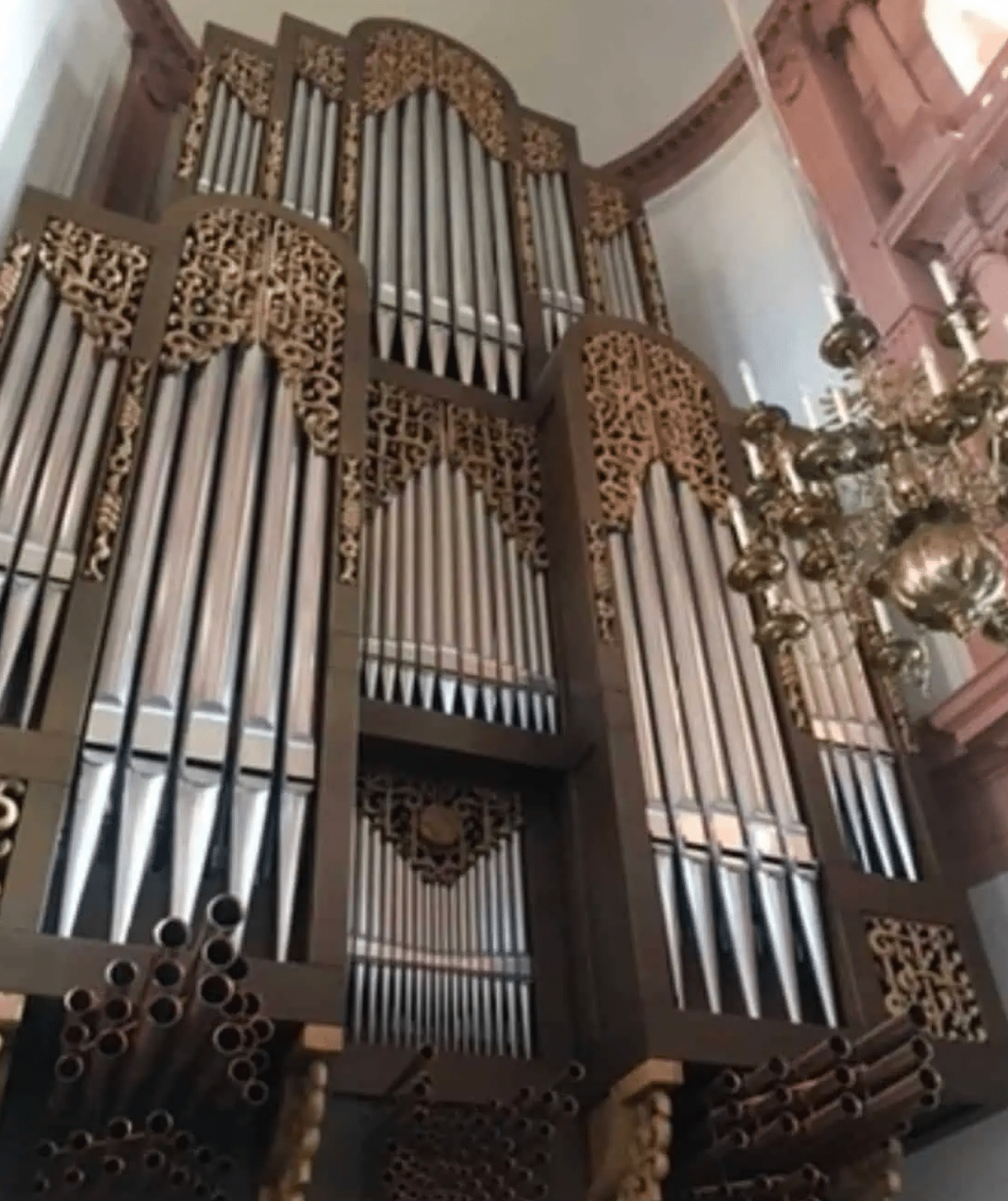 HAUPTWERK (C – c4) 61 TOETSEN: Principal 16′, Principal 8′, Flûte Harmonique 8′, Gedackt 8′, Oktave 4′, Rohrflöte 4′, Nassat 2 2/3′, Oktave 2′, Cornett 2-5 fach, Mixtur 5-7 fach, Cymbel 3-4 fach, Trompete 16′, Trompete 8′, Clairon 4′.